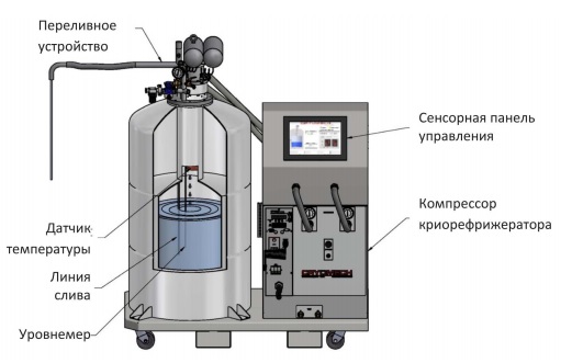 (Рис.2. Структура ожижителя) Ожижители максимально просты в эксплуатации, имеют понятную наглядную панель управления, не требуют дополнительных знаний и навыков у обслуживающего персонала, могут работать в автоматическом режиме без присмотра на протяжении многих дней. Регламентная периодичность проведения ТО - 20 000 часов. Техническое обслуживание чрезвычайно простое заключается оно в замене адсорбера в компрессоре, для этого потребуется 2 рожковых ключа и не более 20 минут. Принцип работы ожижителя построен на использовании двухступенчатого криогенного рефрижератора замкнутого цикла. Рефрижератор установлен в сосуд Дьюара, в который подаётся газообразный гелий чистотой 99,9%. Гелий охлаждается до 40К на первой ступени и постепенно захолаживается до 4.2К на теплообменниках от первой ступени ко второй, вплоть до конденсации на теплообменнике второй ступени. Принцип конденсации гелия на холодном теплообменнике-конденсаторе при атмосферном давлении без дросселирования существенно повышает надежность системы, снижает чувствительность ожижителя к чистоте газообразного гелия. При существенном загрязнении холодного теплообменника достаточно просто отогреть систему и откачать накопительную емкость форвакуумным насосом. Накопительная емкость снабжена уровнемером, позволяющим поддерживать заданный уровень гелия, датчиком температуры и давления, которые отслеживают текущее состояние установки, группой предохранительной арматуры и вакуумным гибким переливным устройством с вентилем выдачи.